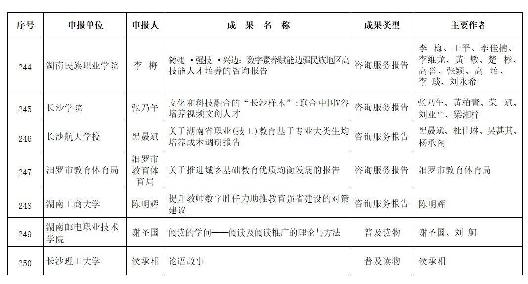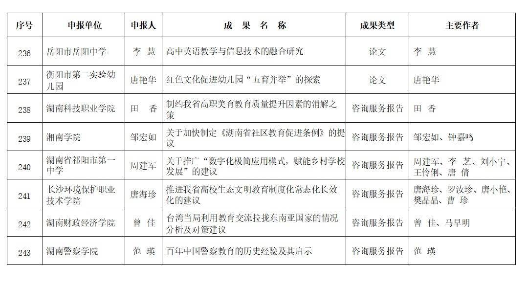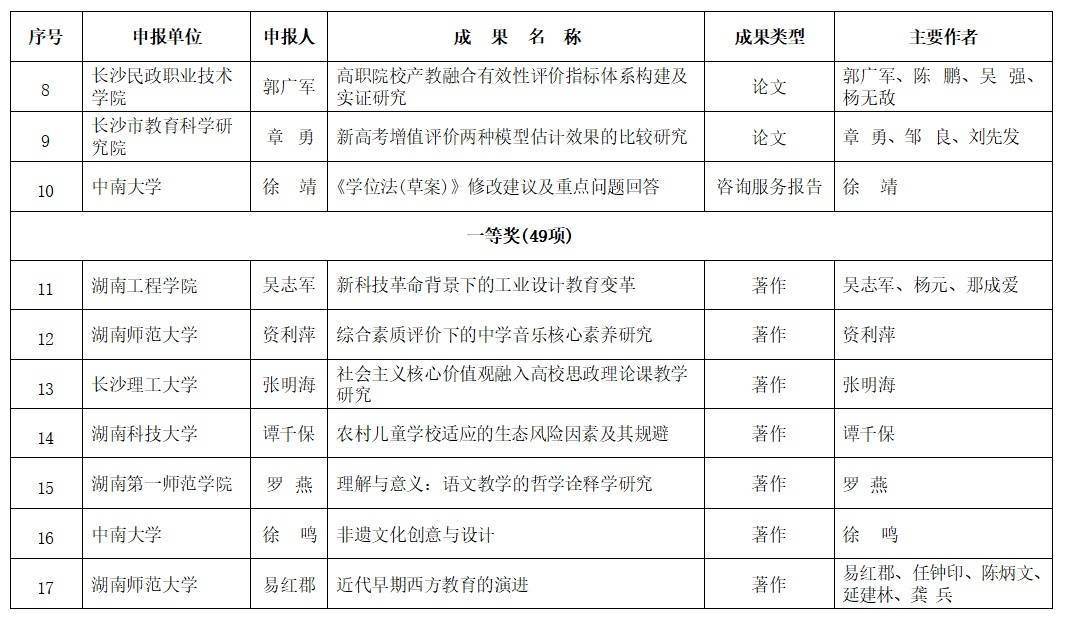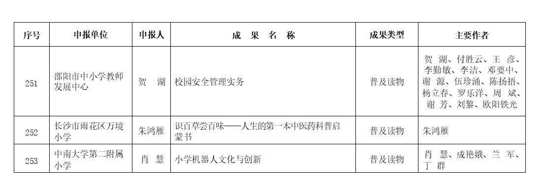 经个人申报与单位推荐、申报成果资格审查、外省专家评审、湖南省教育科学规划领导小组审定,并按程序进行网上公示,共评选出253项获奖成果,其中特等奖10项,一等奖49项,二等奖79项,三等奖115项(名单见附件)。
